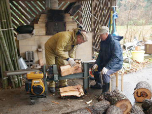 参加者が少なかったのですが活動は薪割り班、炭出し班、食事班に分かれて行いました。薪割り班はさらに「機械部隊」と「人力部隊」の2チームに分かれました。「機械部隊」は薪割り機ですので少し癖の悪い二股に分かれた木を。「人力部隊」は若者が斧で素性の良い木を一刀両断で割るハンディ戦です。機械と言えども曲がったり歪な木はスッキリとは割れませんし機械のペースに合わせて台に木を据え付けなければなりませんので疲れます。機械に使われているという感じです。当然に斧部隊も怪我に細心の注意を払いながら薪を割るという力仕事です。寒い中ですが汗をかきながら頑張ったおかげで炭焼き名人お手製の薪棚が薪で一杯になりつつあります。このまま薪は乾燥のために一年以上の眠りにつきます。ひとり炭を窯から出していただいた炭焼き名人。今回は小枝も一緒に焼いていただきました。小枝は工作に利用しようとしています。料理班の方はいつもの加減で作っていただいたところ、ブリ大根に水菜の芥子和え、具だくさん豚汁&釜飯に、おいしい漬け物5種の豪華メニューが食べきれずに余るという贅沢な悩みが発生。スタッフ一同翌日の昼食もおこぼれに与かりました。役得ムフ。