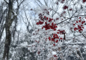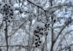 雪の積もったウツギの実はカエルの卵に見えたり、