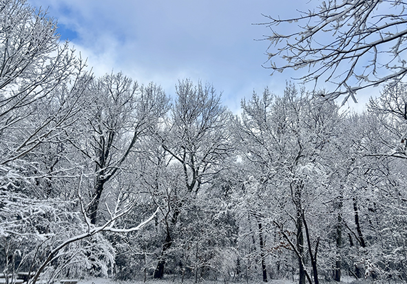 雪の積もったウツギの実はカエルの卵に見えたり、