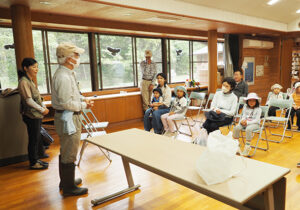 ▼遊林会代表理事の挨拶。森に来るときの服装のお話もありました。