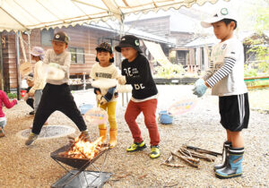 ▼マッチ→スギ葉→細い枝→太い枝と火のリレーが上手にできて、こんなに大きな火になりました。