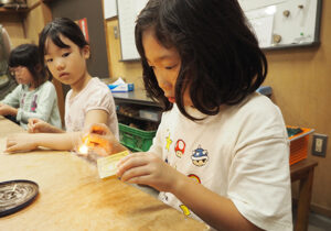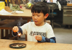 ▼まずはマッチの扱いを練習します。みんな最初は恐る恐る火をつけていましたが、何度もやるうちに少しずつ上手につけれるように。緊張、不安、楽しい、不思議。色んな表情。