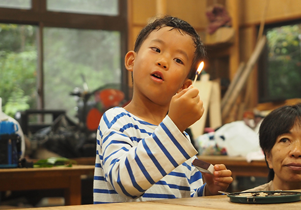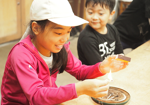 ▼まずはマッチの扱いを練習します。みんな最初は恐る恐る火をつけていましたが、何度もやるうちに少しずつ上手につけれるように。緊張、不安、楽しい、不思議。色んな表情。