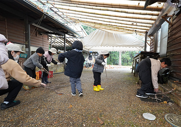 ▼雨で柴が濡れていたので、以前、森の保全活動で作っていた柴と交換しました。みんな前回のたき火の方法をよく覚えていて、細い枝、太い枝を上手に準備してくれました。