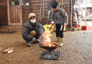 ▼協力して、まずはスギ葉に火をつけます。