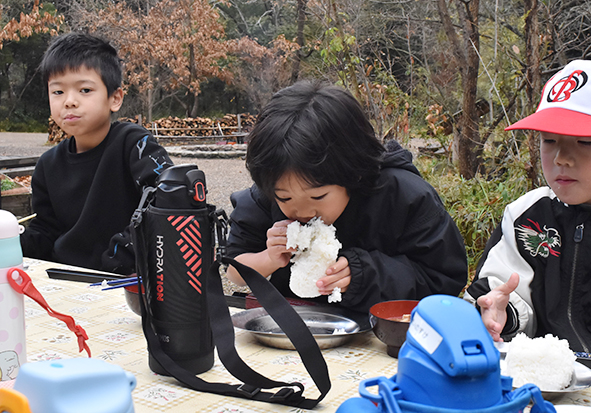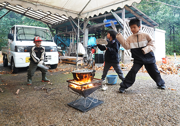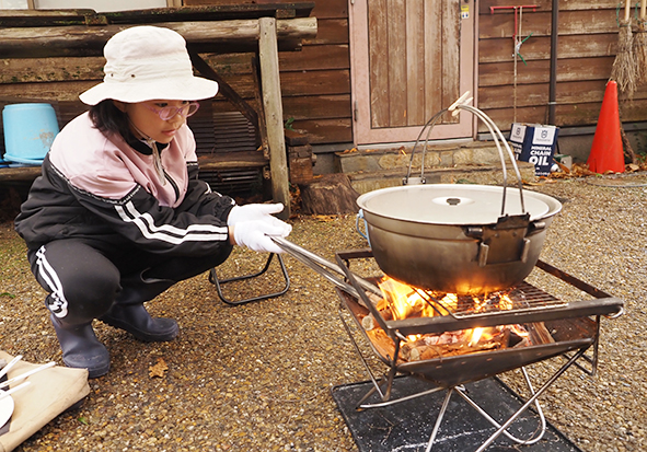 午前中はお昼ご飯づくり。豚汁の野菜を切り、たき火でごはんを炊きました。