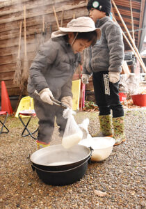 ▼沸騰したらお鍋にお米を入れて、次はカシの薪をくべて、引き続き燃やしていきます。火の番の間はゆっくりとお話タイムも楽しかったですね。
