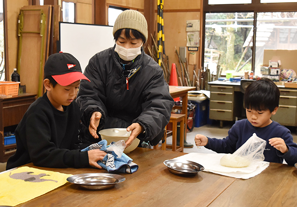 ▼炊けたご飯はとても熱いのでタオルを使って大きなおにぎりを作りました。