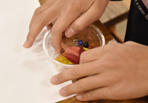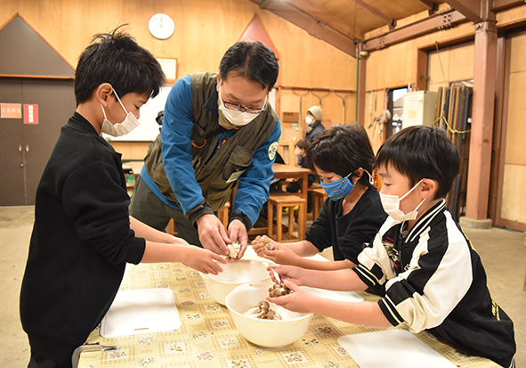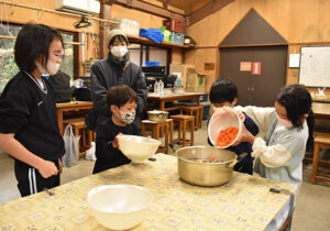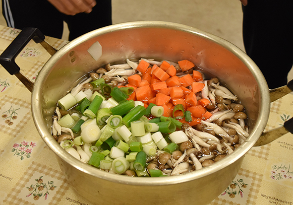 ▼2班に分かれて、豚汁用の野菜切り、おにぎりのためのお米の用意をしました。しめじは1本づつほぐします。