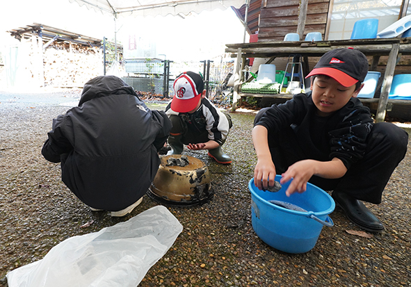 ▼ご馳走様の後は、真っ黒になったお鍋も自分たちで磨きました。「このお鍋、こんな色だったんだぁ…」と気づいてくれるぐらいピカピカになりました☆冷たい水を使いながらありがとうね!
