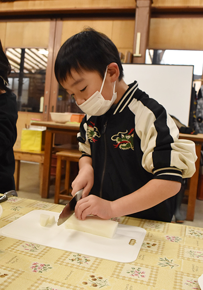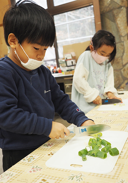 ▼大根、長ネギ、ニンジンは包丁を使って切りました。みんな包丁を使うのがとても上手でした。