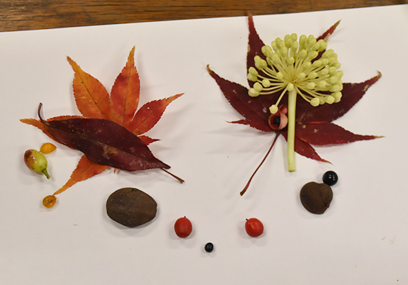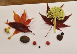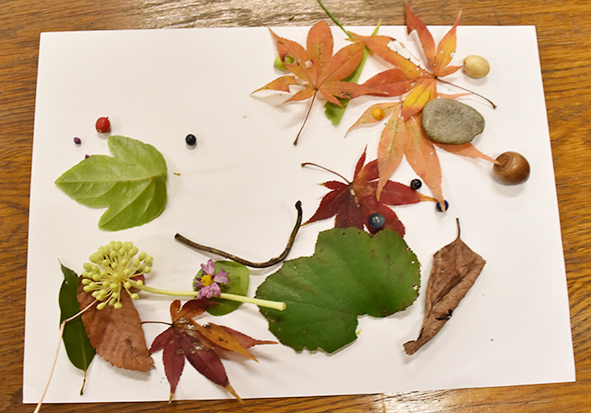 ▼森に遊びに来てくださった方たちにも秋の森のカラフルを知っていただきたいので、みんなが見つけてくれた宝物はケースに入れて、しばらくネイチャーセンターに展示しますね。