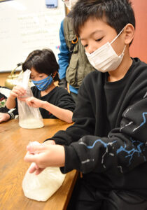 ▼ご飯はポリ袋炊飯です。災害時にも役に立つ方法です!目盛りを見る人、お水を入れる人を決めて準備しました。