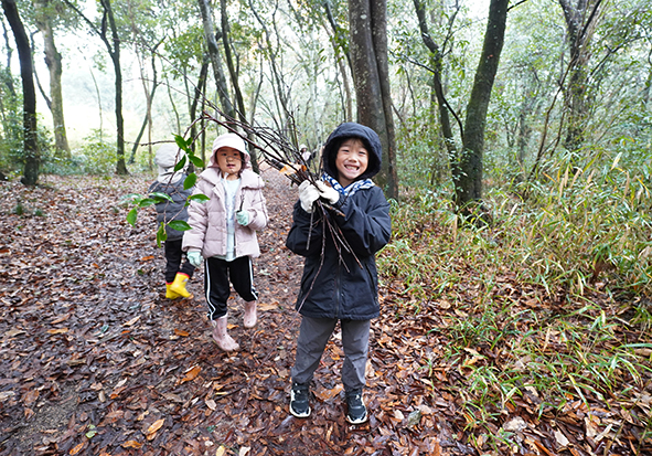 ▼調理が終わったら柴刈りです。小雨の中、みんな手際よく柴を集めることができました。
