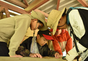 ▼シェルター下では、アリジゴク探し。もう、みんなの眼がハンターです!