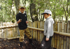 ▼拾ってきた柴のうち、太いものは昨日の雨で湿気ていたので、乾いたものと交換。森でよく燃えるスギ葉、拾った小枝、太い柴を用意し、午前中に練習したマッチを使い、着火しました。「枝はバッテンに入れるよ」隊長の話をしっかり聞いて実践してくれました。