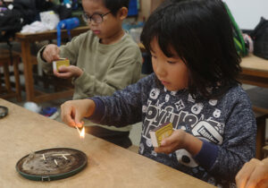 ▼たき火をするために、まずマッチにちょうせんです!マッチをさわるのも初めての子もいるので、最初はみんなでマッチの火をリレーしていきました。