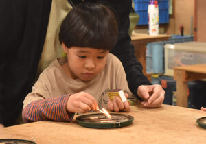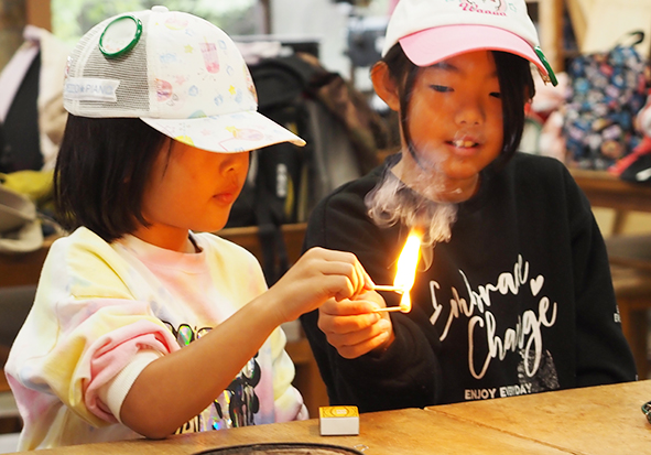 ▼たき火をするために、まずマッチにちょうせんです!マッチをさわるのも初めての子もいるので、最初はみんなでマッチの火をリレーしていきました。