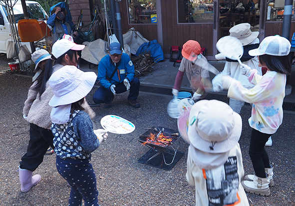 ▼大きな火がつけられたら、隊長から合格がもらえます。もう少し火力が必要な班に、合格をもらえた班の子が手伝いにきてくれました。みんなであおいでパワーアップ!!