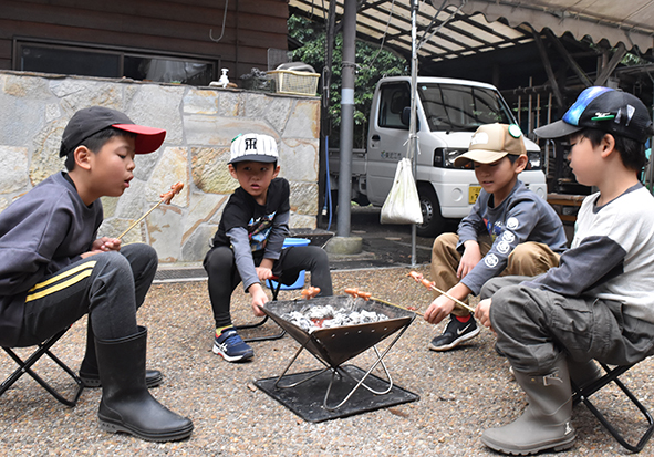 どの班も無事に火がつき、ご褒美に森の木々でできた炭を入れてもらいました。炭に火をつけてどうするかって?もちろん!美味しいものを焼きました!