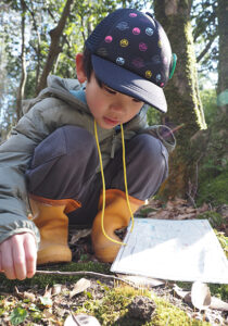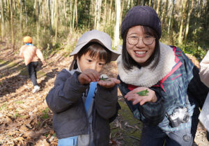 ▼野神さんのエリアは、常緑樹(一年中葉をつけている)のアラカシの木がたくさんあり、すぐそばに川もあることもあり、地面にコケが生えています。そのコケを触っていると「睫毛みたい」との感想。そんな風にコケをみたことがなかったのですが、本当に睫毛みたいでした。少しうらやましいくらいのびっしり睫毛(コケ)でした(笑)