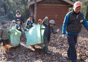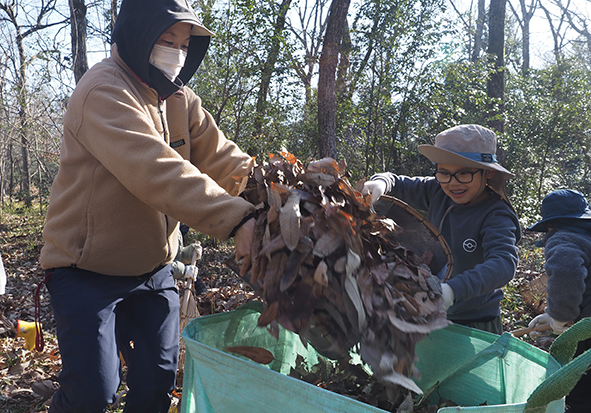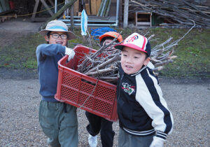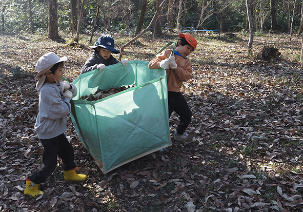▼バックにいっぱい落ち葉がたまったら、午前中に遊んだ竹柵まで運びます。「僕も持つわ!」と周りの様子をみて自然と動く子どもたち。