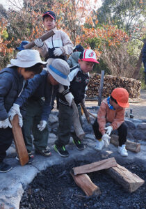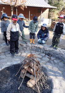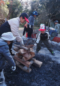 ▼「一番下に大きな薪を置いていこう」と子どもたち同士で声をかけ合いながら、ドンドン積んでいきました。細い木は一番上にそっと。崩れないようにおけるか、そっと見守るみんなの姿。