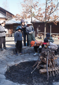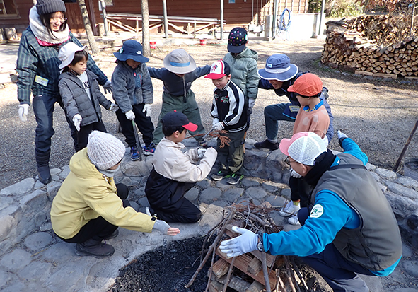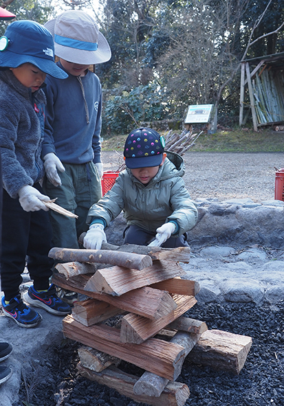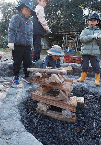▼組んだ薪の中に、燃えやすい杉葉、細い柴、太い枝を入れていきます。「この隙間から入れたらいいよ!」「ここから着火しようか!」など、木を組みながらいろいろとアイデアが浮かびました。