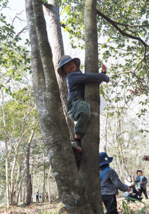 ▼地図を見ながら野神さんの場所へ一直線に見えましたが、森の中には楽しいものがいっぱい!少し高いところに足をかけないと登れない木でしたが、友達や隊長がお尻や足を支えてあげて、木登り。