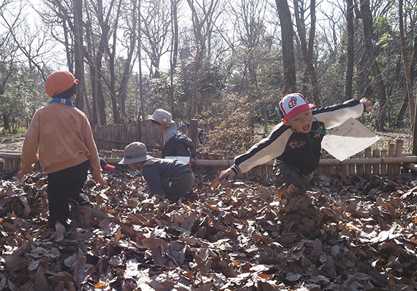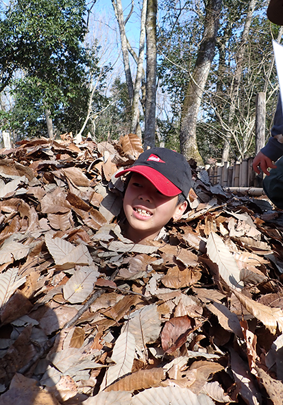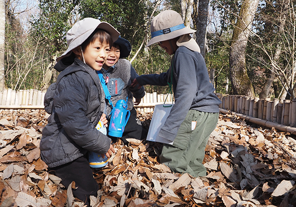 ▼カブトムシのベッドにも寄りたい、カブトムシの幼虫に会いたい、と行ったのですが、竹柵の中には落ち葉がどっさり!がっかりするかと思いきや、楽しさを見つけるのが上手な子どもたち。やった~!と落ち葉で遊びはじめました。カブトムシの幼虫の気持ちになりたいと言う子もいましたよ!