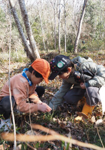 ▼明るい林床には、赤や青のきれいな実が。「それどこにあるの?」「えっ、ここにあるで!」と子どもたち同士で教えあいっこ。