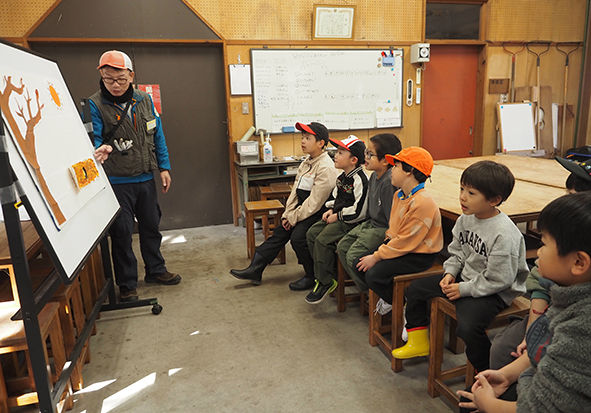 ▼午後のミッションを分かり易くパネルシアターでお話を聞きながら、落ち葉かきについての理解を深めます。最初は静かに聞いていたのですが、道具が森に置いてけぼりになったところで大爆笑!みんな笑いのツボが一緒。