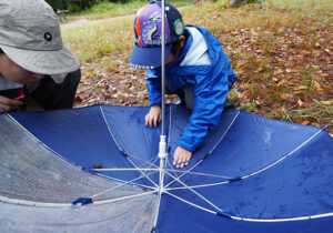 ▼少し雨が弱くなってきたら、傘が今度は虫カゴに大変身。大きなコオロギと小さなコオロギが入っており、「大きさがこんなに違うんだね」と気づくことができました。