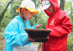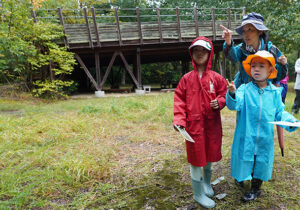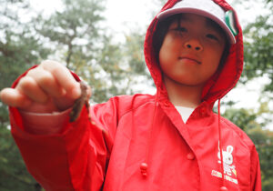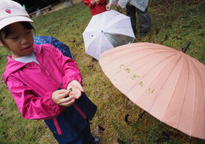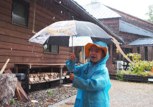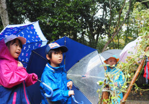 ▼今日は朝から雨がザーザー。カッパを着て、傘をさして準備万端で森たんけんへ!