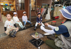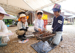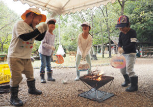 ▼たき火台の準備も、4人で力を合わせて行います。スギの葉っぱはどのくらいの量だったかな?