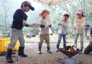 今日はお休みの子が多く、森も雨でどんよりとしていたので、どんな1日になるかと思っていましたが、みんな雨でも笑顔いっぱいで、さらに森たんけんのときも、たき火の時も協力し合ったり、ほめあったり、気付きを与え合ったり、よいチームワークだなぁと感心していました。