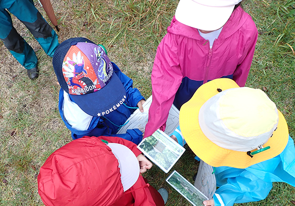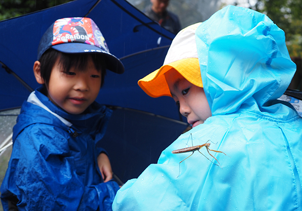 ▼少し雨が弱くなってきたら、傘が今度は虫カゴに大変身。大きなコオロギと小さなコオロギが入っており、「大きさがこんなに違うんだね」と気づくことができました。