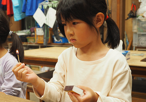 ▼たき火をするために、まずマッチにちょうせんです!マッチのすり方や、すったあとの持ち方などを実演しながら説明しました。