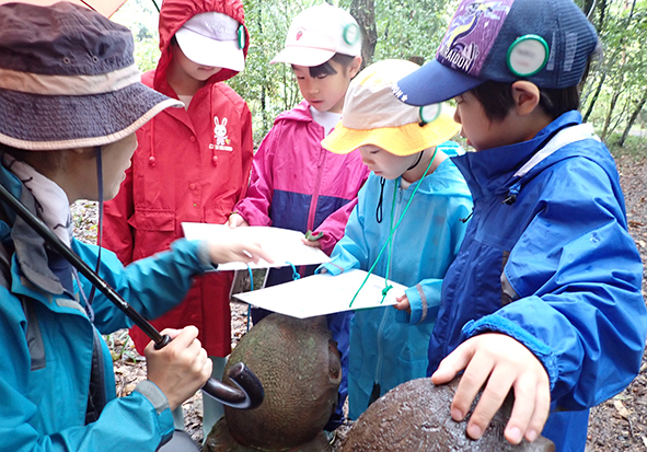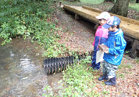 ▼今日は朝から雨がザーザー。カッパを着て、傘をさして準備万端で森たんけんへ!