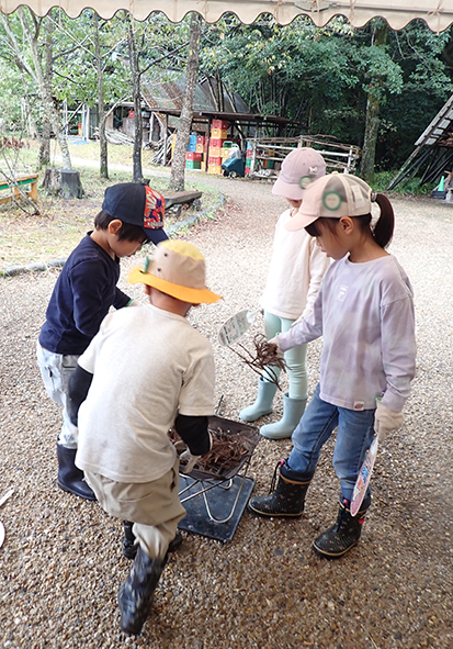▼たき火台の準備も、4人で力を合わせて行います。スギの葉っぱはどのくらいの量だったかな?