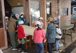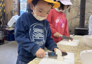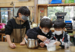 ▼2班に分かれて、豚汁用の野菜切り、おにぎりのためのお米の用意をしました。みんなお家でもお料理をしているようで包丁を使うのがとても上手でした。