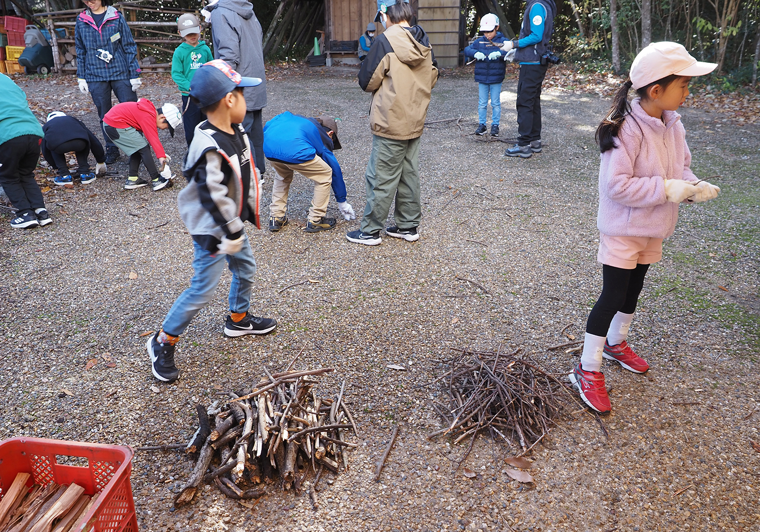 ▼森の中からいい柴をたくさん集めてこれました。前回のたき火の方法を思い出しながら、たき火台に入るサイズに揃えていきました。