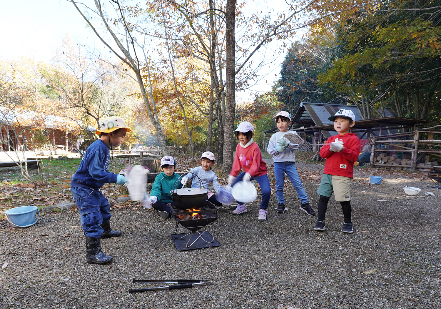 ▼朝のお話では昨日と明日がお誕生日だと教えてくれた子がいたので、みんなでバースデーソングを歌いお祝い♡ その後、今日のミッションが書かれたパズルをみんなで解きました。出てきたミッションは「たき火をつけて大きなおにぎりをつくろう!あと、とんじるもね!」でした☆