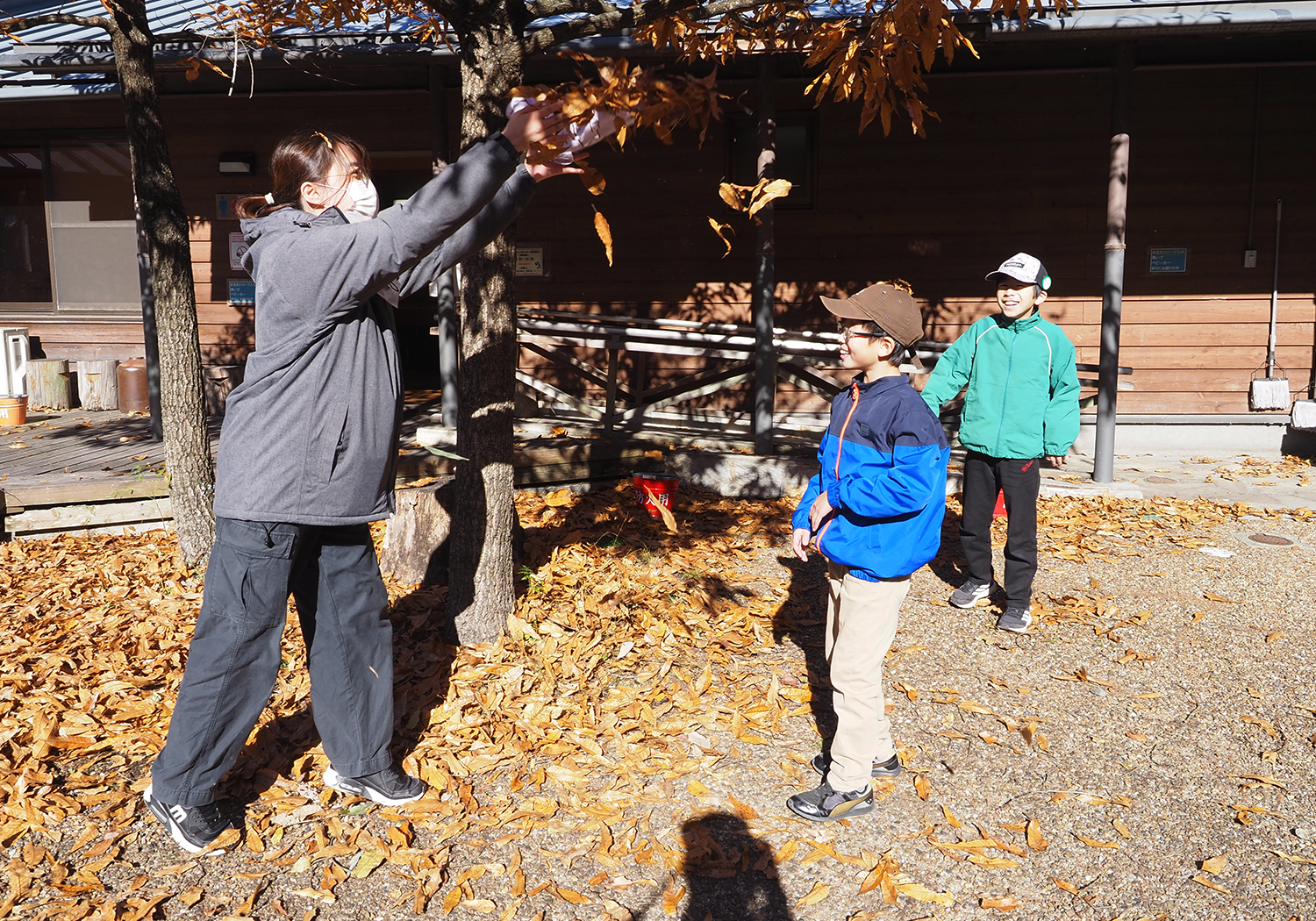▼休憩時間はたくさんの落ち葉で落ち葉シャワーをしたり、ハートを作ったり♡