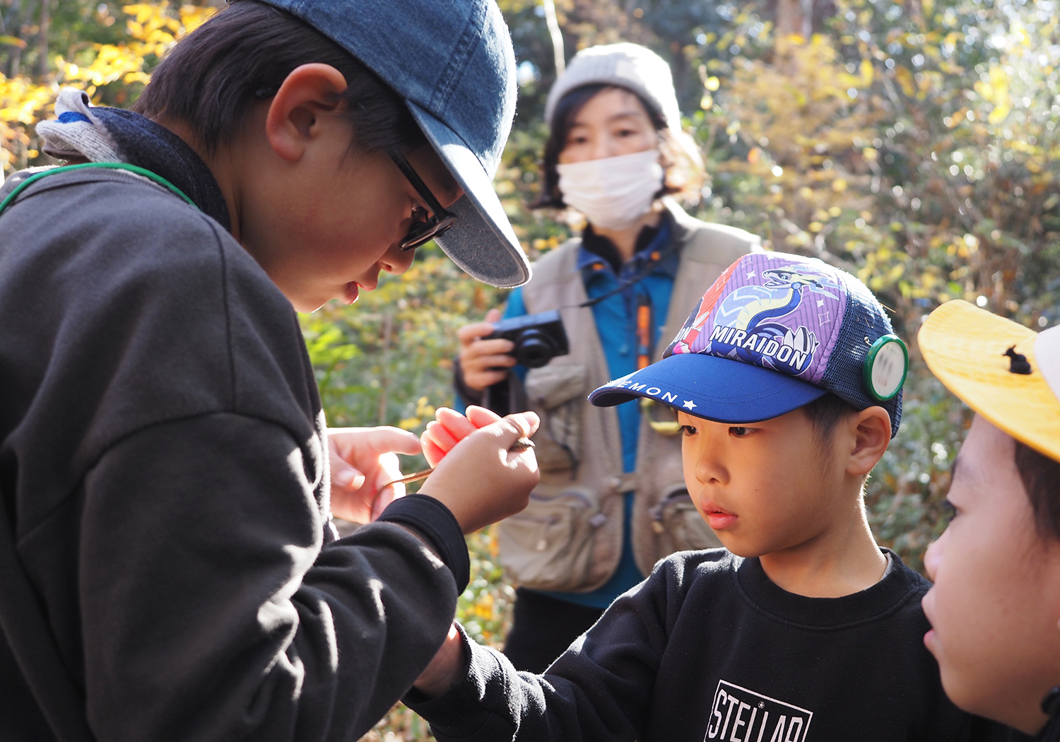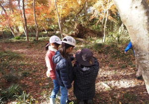 ▼今日は暖かく、日当たりのよいところでカナヘビに出会いました。「もうそろそろ冬眠する時期だよね。また、来年会おうね~」と大好きなカナヘビと触れ合ったあと、優しく森に返してくれるくぬぎ隊の子たちでした。