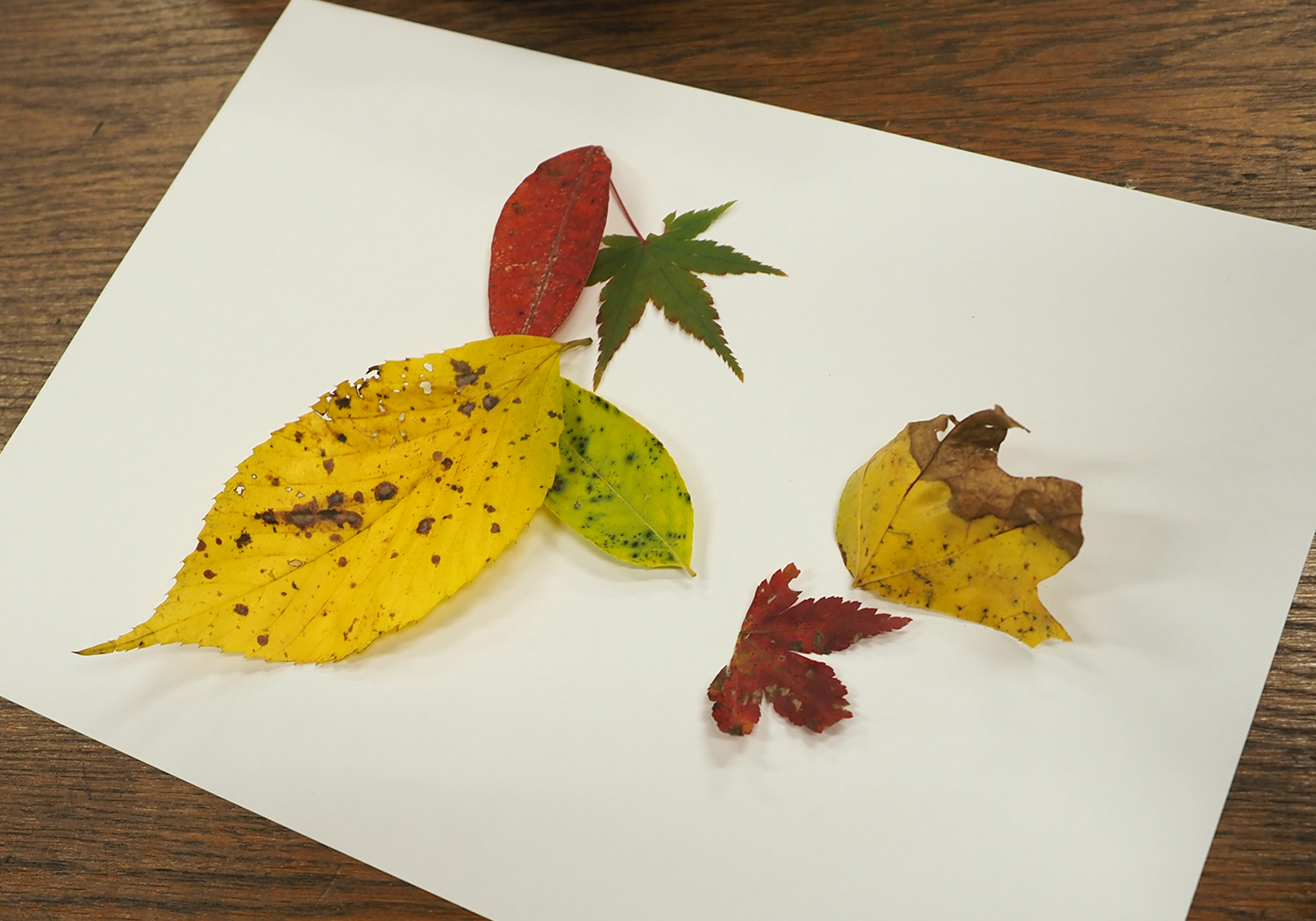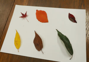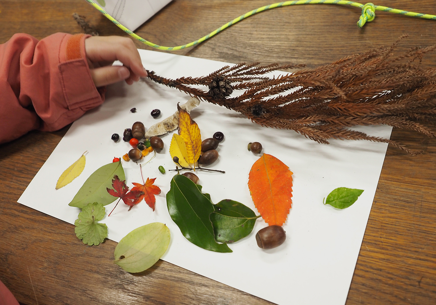 ▼作業小屋に帰ってから、みんなで見つけたものを見せ合いっこしました。きれいですね~♡秋の森にはこんなに色とりどりで素敵なものがあるのですね☆みんな見つけるのがとても上手でした。