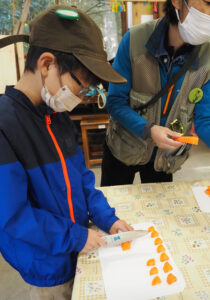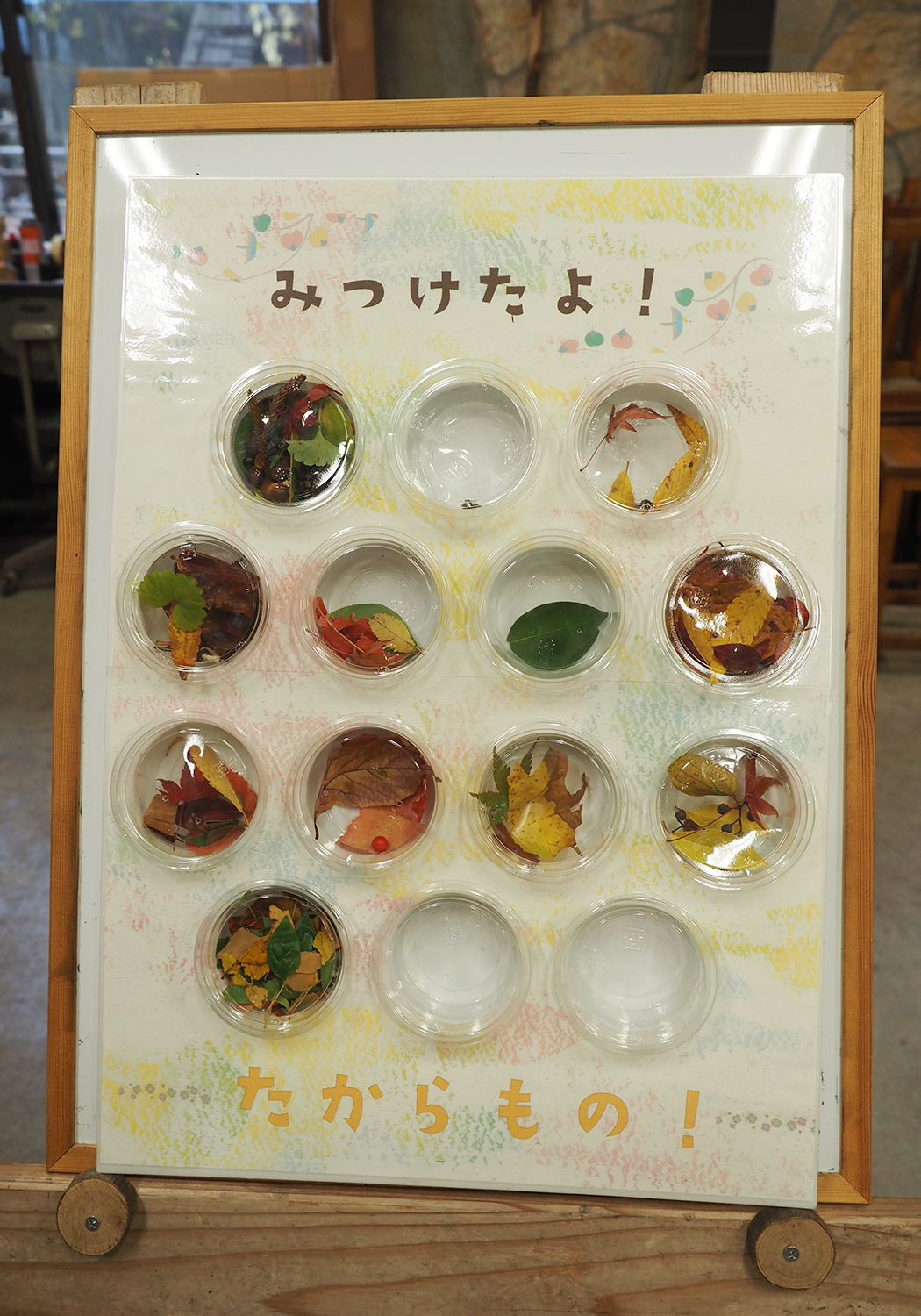 ▼森に遊びに来てくださった方たちにも秋の森のカラフルを知っていただきたいので、みんなが見つけてくれた宝物はケースに入れて、しばらくネイチャーセンターに展示しますね。