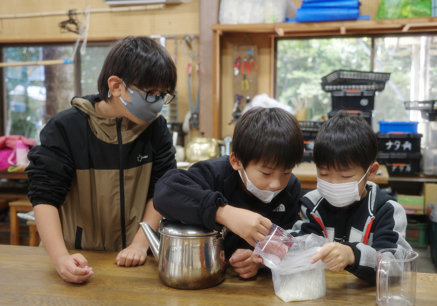 ▼お米は無洗米を使い、ポリ袋でご飯を炊きます。150mlの水を計量カップで測り、お水が袋からこぼれないように隊員同士で支え合いながら頑張りました!