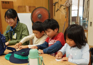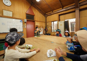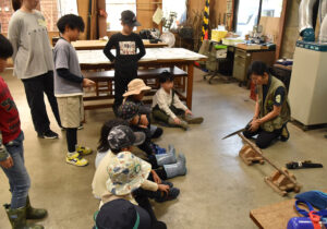 ▼お昼のお弁当をおいしくいただいて、お昼からはミッション②の「つるりんをつくろう」。隊長からしっかりとのこぎりの使い方を学びます。