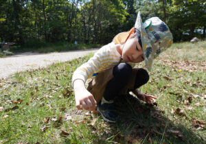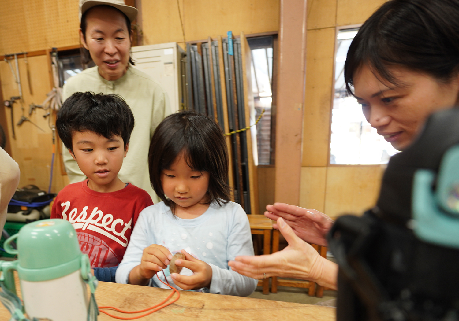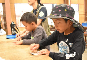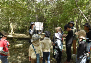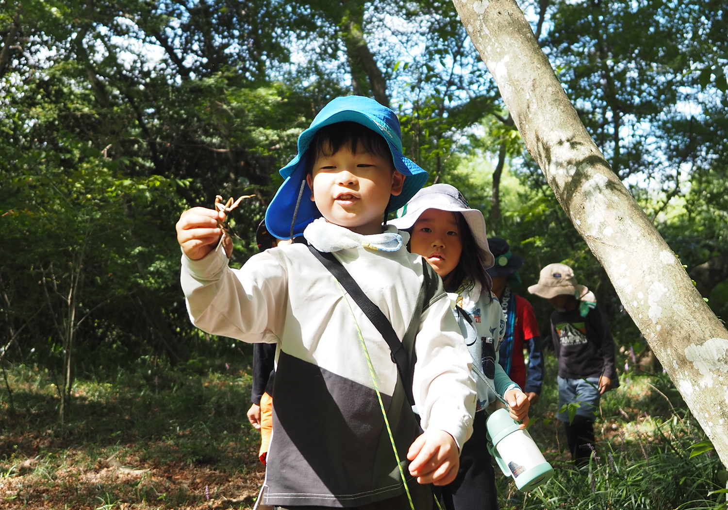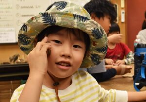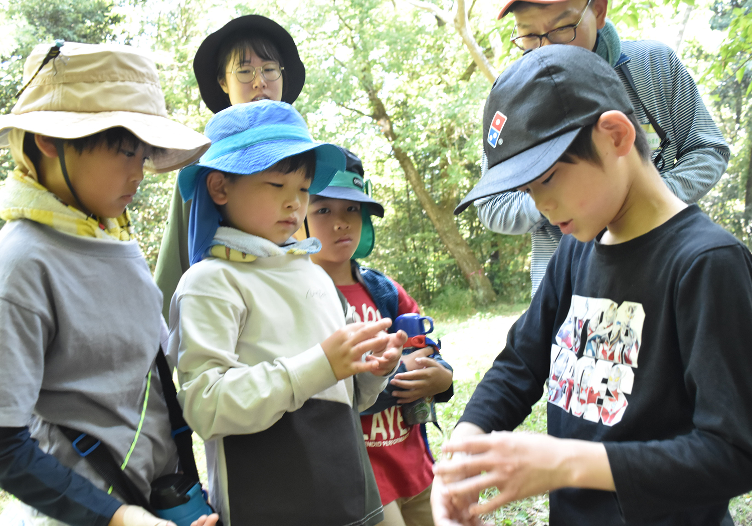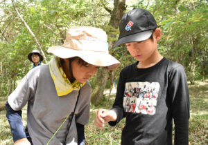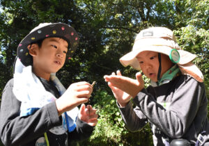 ▼みんな本当にいきものを見つけるのが上手です! 捕まえられたいきものは観察して森に返しました。